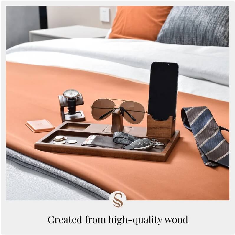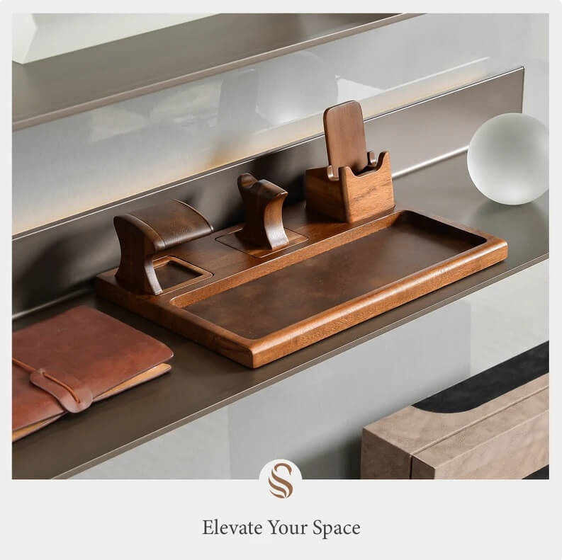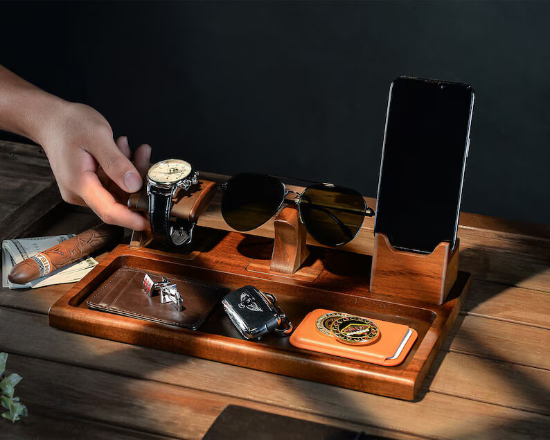 This sophisticated valet tray features dedicated spots for glasses, phone, and watch, and can be customized with initials, a memorable date, or a heartfelt message for a unique touch.