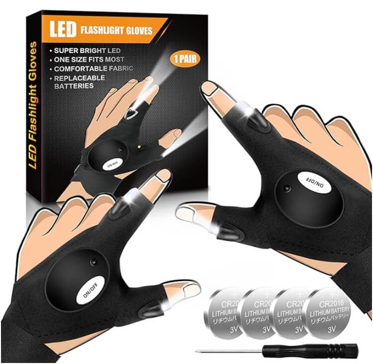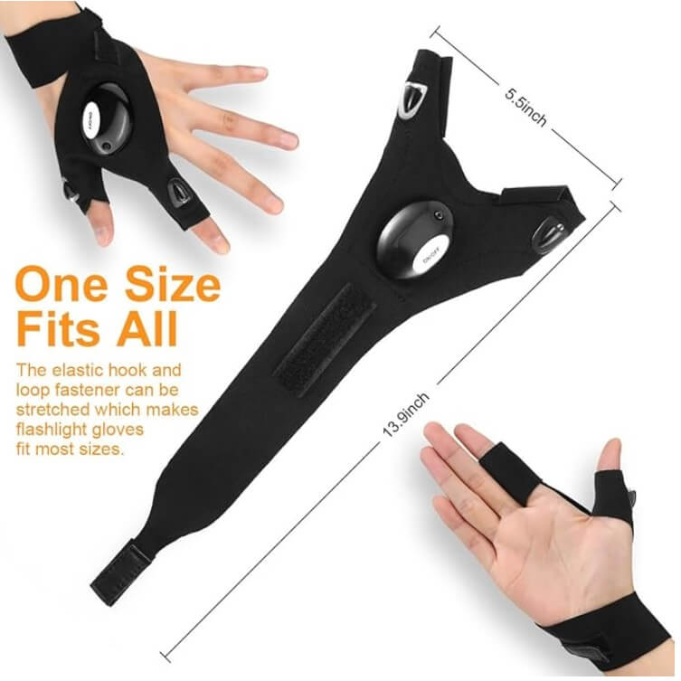 Waterproof, comfortable, and adjustable LED flashlight gloves with built-in lights for hands-free tasks. Ideal for outdoor activities and trades.