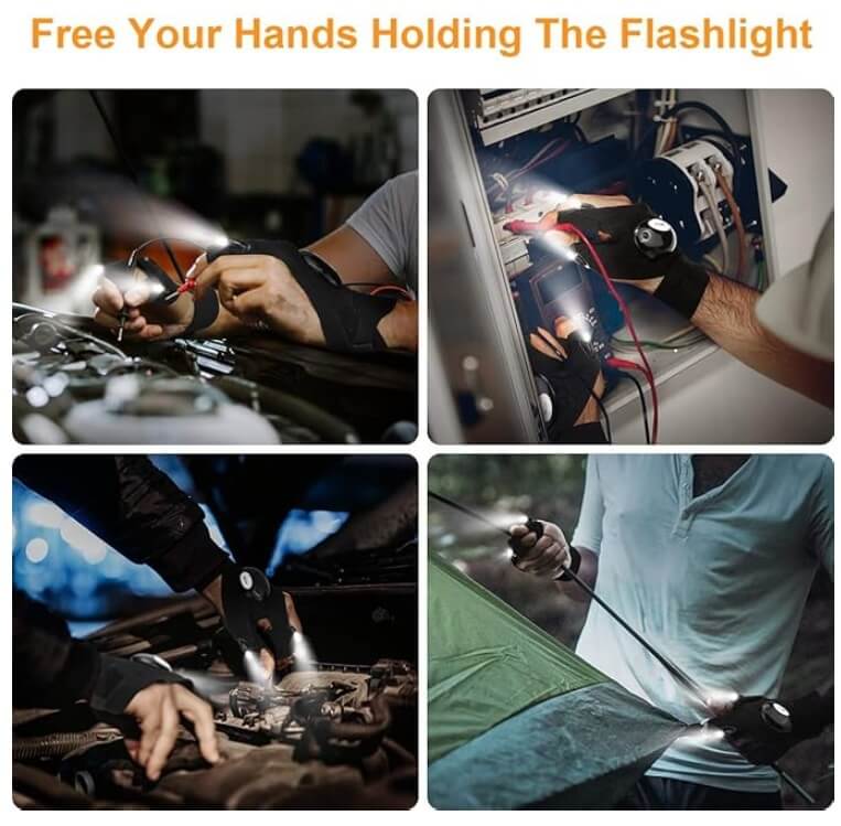 Adjustable LED gloves with lights, perfect for hands-free tasks.