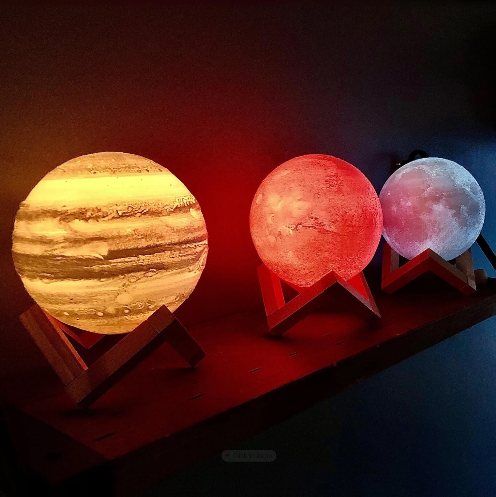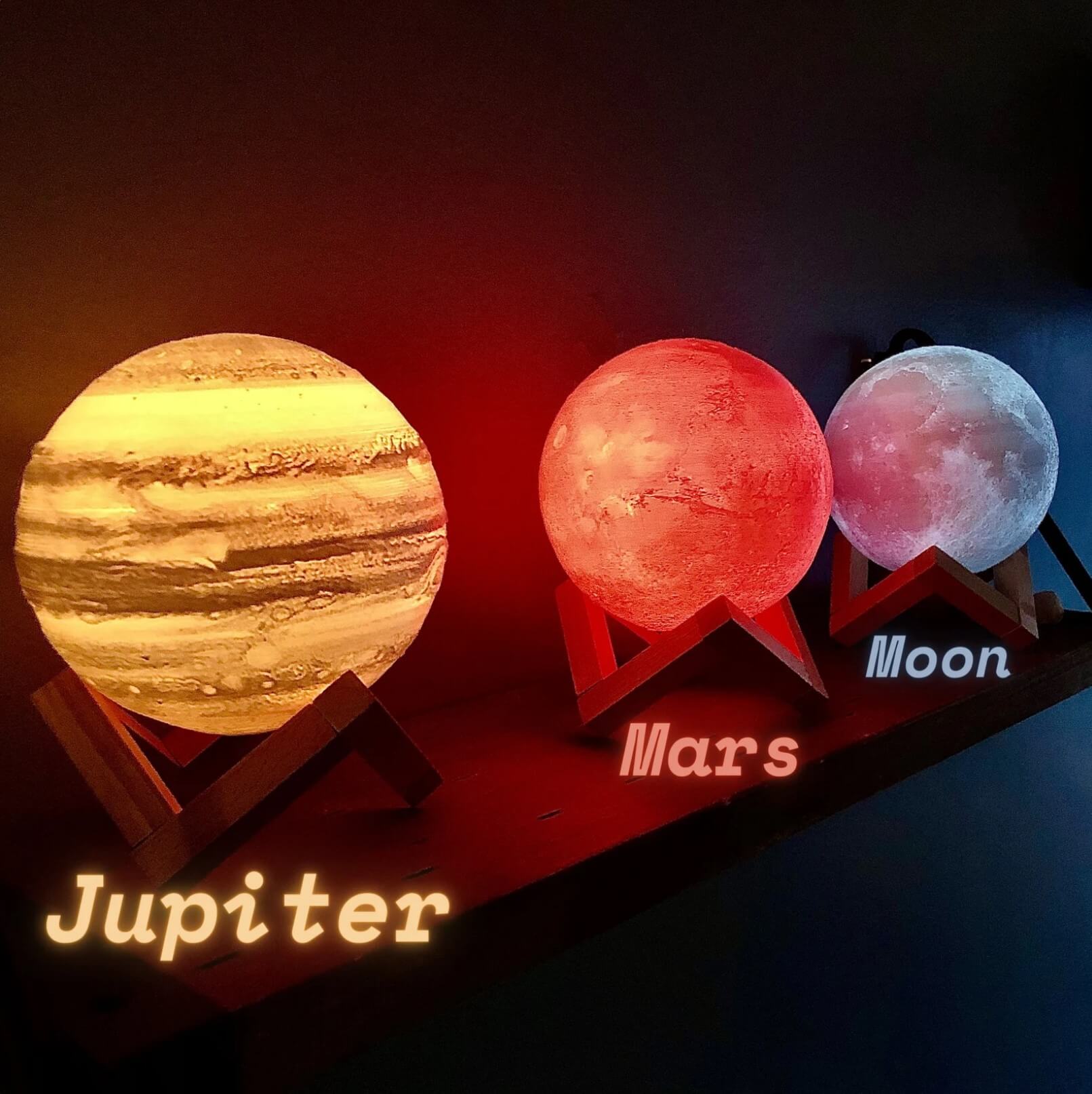 These planet lamps are 3D printed from environmentally friendly PLA plastic, using publicly available space images, and come in 16 colors. They fit well on shelves, desks, and tables, adding a unique touch to any room. Perfect gifts for those interested in science, astrology, or astronomy.