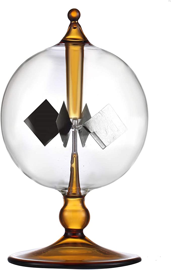 Photons, those amazingly fast travelers, come a-knocking on the tiny plates of this solar radiometer. Newton’s first law of motion does the rest of the work and the plates rotate as if by magic.